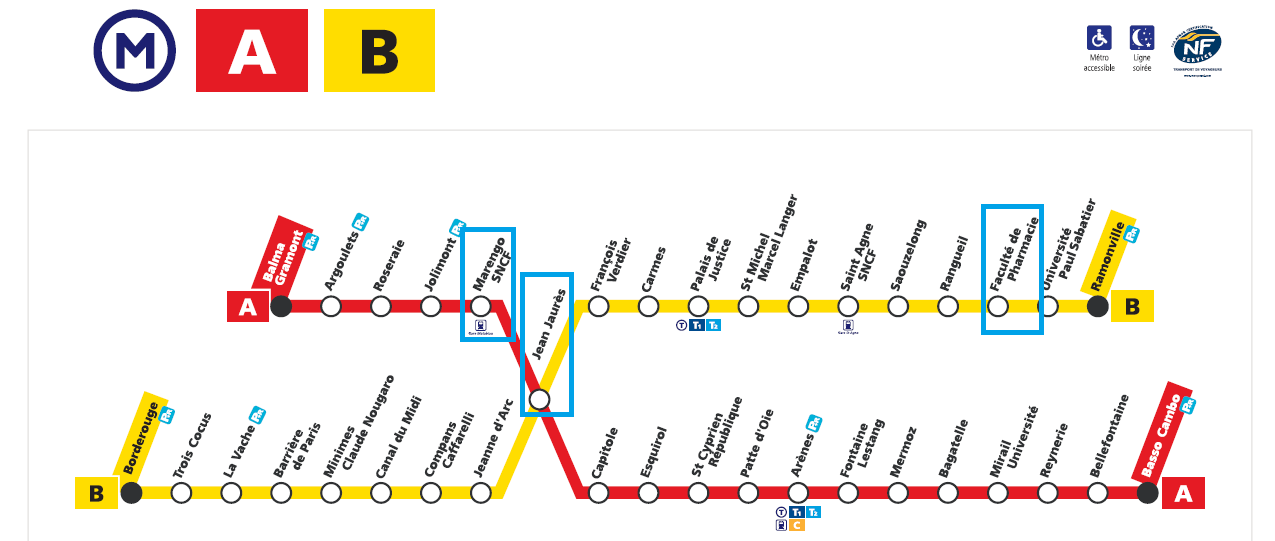 Depuis la gare SNCF Toulouse Matabiau : prendre le métro ligne A direction Basso Cambo, arrêt à la station suivante 'Jean Jaurès' pour prendre le métro ligne B direction Ramonville jusqu'à l'arrêt 'Faculté de Pharmacie' (environ 30 minutes en tout).