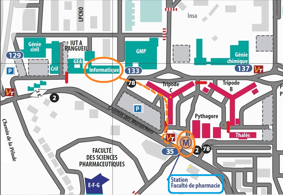 Depuis l'aéroport de Toulouse-Blagnac : prendre le tram ligne T2 jusqu'au terminus 'Palais de Justice' puis prendre le métro ligne B direction Ramonville, jusqu'à l'arrêt 'Faculté de Pharmacie' ou prendre le bus-navette direction gare SNCF Matabiau arrêt 'Jeanne d'Arc' puis prendre le métro ligne B direction Ramonville, jusqu'à l'arrêt 'Faculté de Pharmacie'. Pour en savoir plus